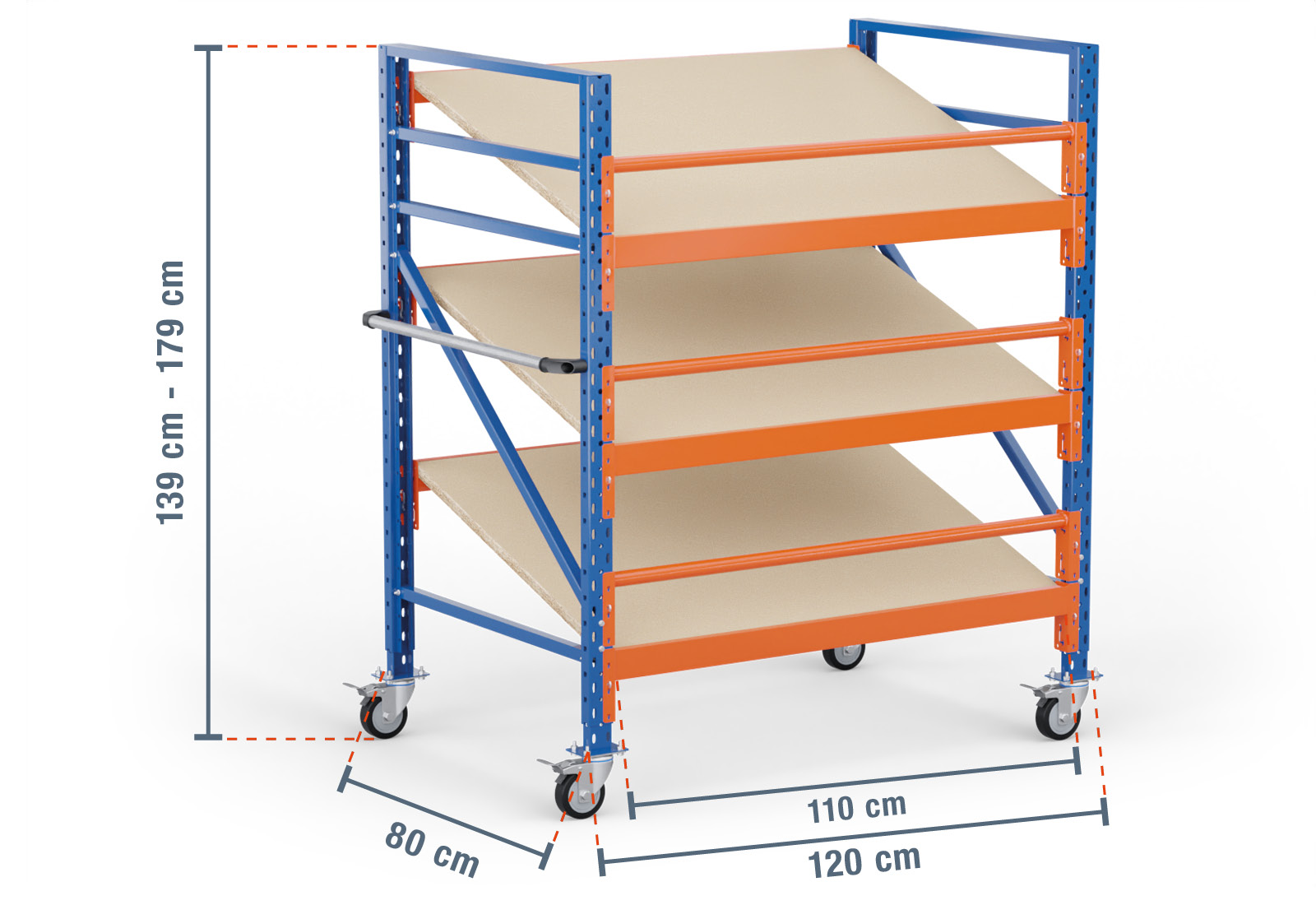 Wymiar zewnętrzny tego regału ze skośnymi półkami na kółkach wynosi 1,2 m, przy czym użyteczna powierzchnia półki, tzw. wymiar wewnętrzny, jest o 10 cm krótsza. Tutaj maksymalna nośność półki regału 300 kg i obciążenie pola (maksymalne obciążenie pomiędzy dwoma stojakami regałowymi przy równomiernym rozłożeniu ciężaru) wynosi 500 kg.