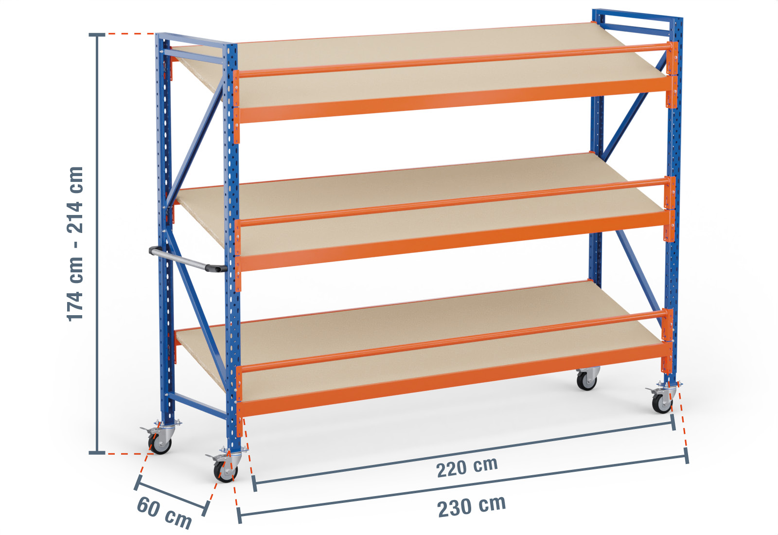 Wymiar zewnętrzny tego regału ze skośnymi półkami na kółkach wynosi 2,3 m, przy czym użyteczna powierzchnia półki, tzw. wymiar wewnętrzny, jest o 10 cm krótsza. Tutaj maksymalna nośność półki regału 300 kg i obciążenie pola (maksymalne obciążenie pomiędzy dwoma stojakami regałowymi przy równomiernym rozłożeniu ciężaru) wynosi 500 kg.