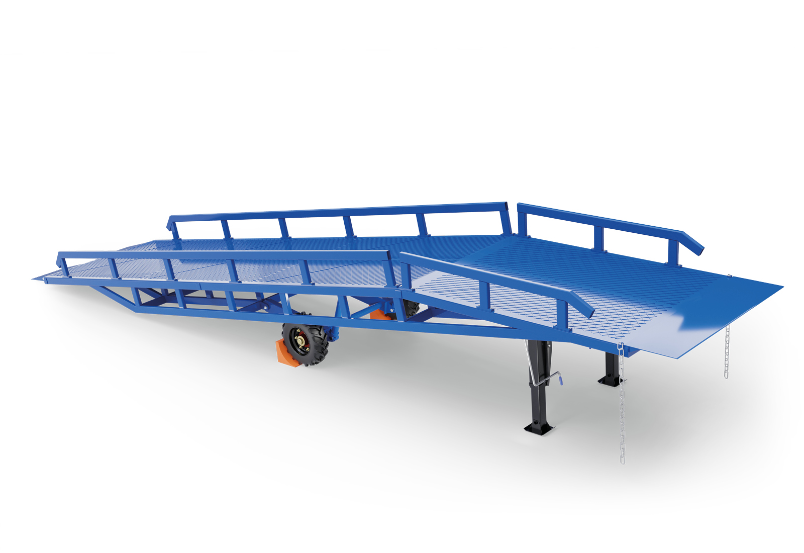 Zamontowane na stałe łańcuchy bezpieczeństwa i solidne klocki hamulcowe na rampie zapewniają bezpieczne pozycjonowanie nawet przy pełnym obciążeniu. Antypoślizgowa struktura siatki powierzchni zapewnia optymalną przyczepność nawet w niekorzystnych warunkach pogodowych, takich jak deszcz i śnieg. Zintegrowana poręcz wspomaga bezpieczny wjazd i zapobiega wypadkom spowodowanym upadkiem lub poślizgnięciem.