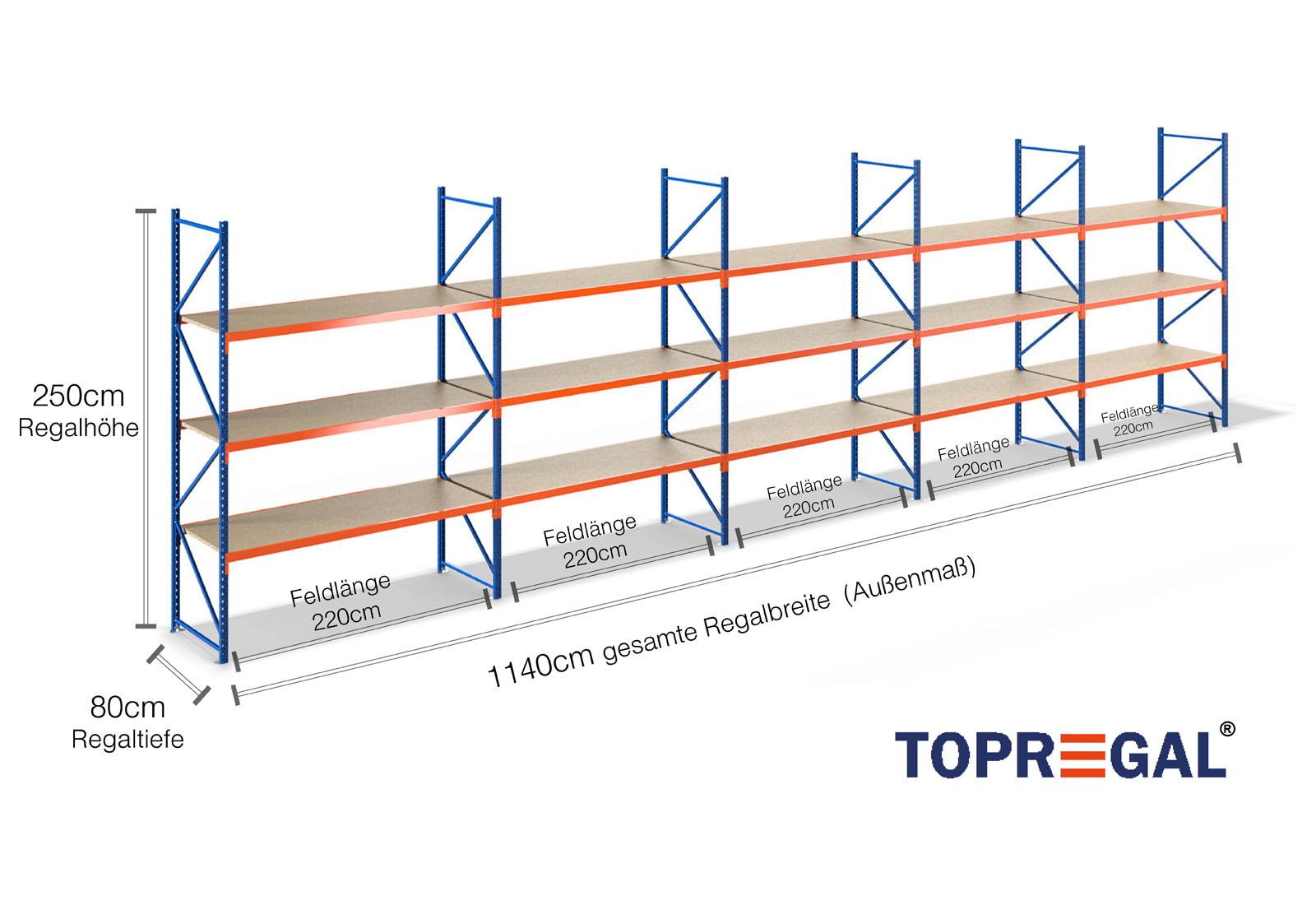 Ten regał magazynowy przekonuje swoją wysokością wynoszącą 2,5 m, ma 80 cm głębokości i szerokość 11,4 m. Każdy z 3 poziomów zapewnia maksymalne obciążenie wynoszące 500 kg, przy czym maksymalne obciążenie między dwoma stojakami (obciążenie pola) wynoszące 2.000 kg nie może być przekroczone. Specyfikacje te odnoszą się zawsze do równomiernego obciążenia regałów. Montaż jest szybki i łatwy dzięki systemowi wtykowemu. Do regałów o szerokich przęsłach TOPREGAL dostępny jest również szeroki wybór indywidualnych części i akcesoriów, takich jak stojaki regałowe, trawersy, taśmy magnetyczne i skrzynki regałowe z otwartą przednią częścią.