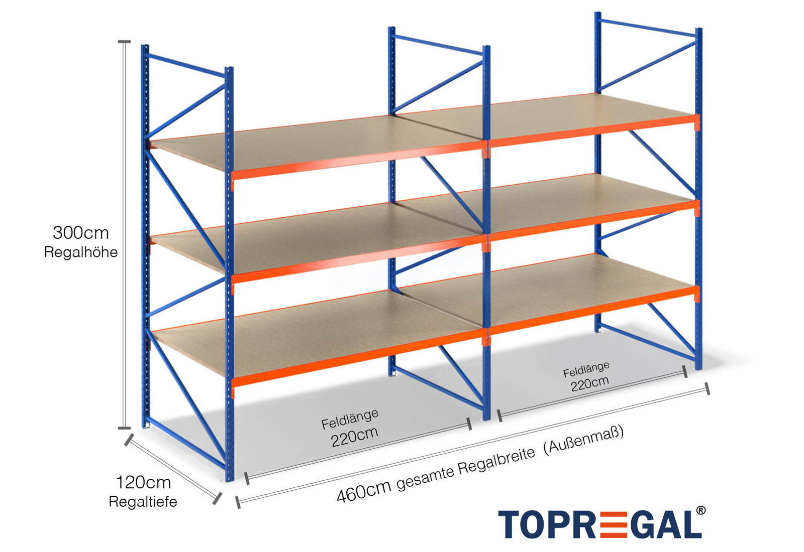 Ten regał magazynowy przekonuje swoją wysokością wynoszącą 3 m, ma 120 cm głębokości i szerokość 4,6 m. Każdy z 3 poziomów zapewnia maksymalne obciążenie wynoszące 500 kg, przy czym maksymalne obciążenie między dwoma stojakami (obciążenie pola) wynoszące 2.000 kg nie może być przekroczone. Specyfikacje te odnoszą się zawsze do równomiernego obciążenia regałów. Montaż jest szybki i łatwy dzięki systemowi wtykowemu. Do regałów o szerokich przęsłach TOPREGAL dostępny jest również szeroki wybór indywidualnych części i akcesoriów, takich jak stojaki regałowe, trawersy, taśmy magnetyczne i skrzynki regałowe z otwartą przednią częścią.
