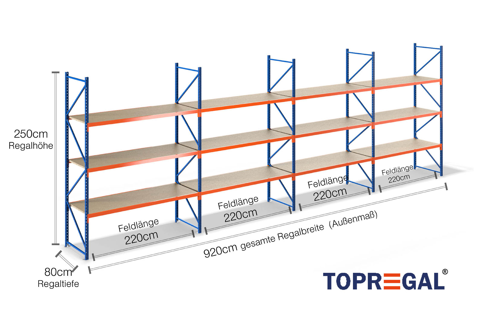 Ten regał magazynowy przekonuje swoją wysokością wynoszącą 2,5 m, ma 80 cm głębokości i szerokość 9,2 m. Każdy z 3 poziomów zapewnia maksymalne obciążenie wynoszące 500 kg, przy czym maksymalne obciążenie między dwoma stojakami (obciążenie pola) wynoszące 2.000 kg nie może być przekroczone. Specyfikacje te odnoszą się zawsze do równomiernego obciążenia regałów. Montaż jest szybki i łatwy dzięki systemowi wtykowemu. Do regałów o szerokich przęsłach TOPREGAL dostępny jest również szeroki wybór indywidualnych części i akcesoriów, takich jak stojaki regałowe, trawersy, taśmy magnetyczne i skrzynki regałowe z otwartą przednią częścią.