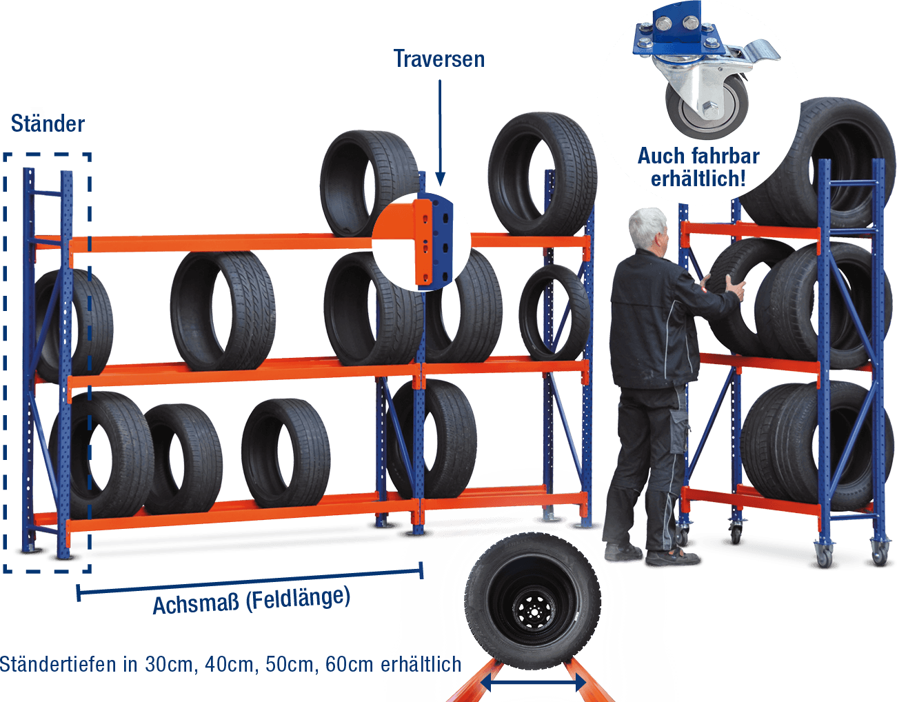 Nie ma znaczenia, czy chcesz przechowywać opony, felgi czy kompletne koła: Oferujemy odpowiednią głębokość bagażnika dla wszystkich popularnych rozmiarów opon. Trzy dostępne głębokości można łatwo wybrać w konfiguratorze. W najmniejszej wersji podstawowy bagażnik oferuje miejsce na osiem kół. Dzięki modułowej konstrukcji można łączyć i rozbudowywać dowolną liczbę stojaków na opony. Poprzeczki można również zaczepiać indywidualnie na różnych wysokościach.
