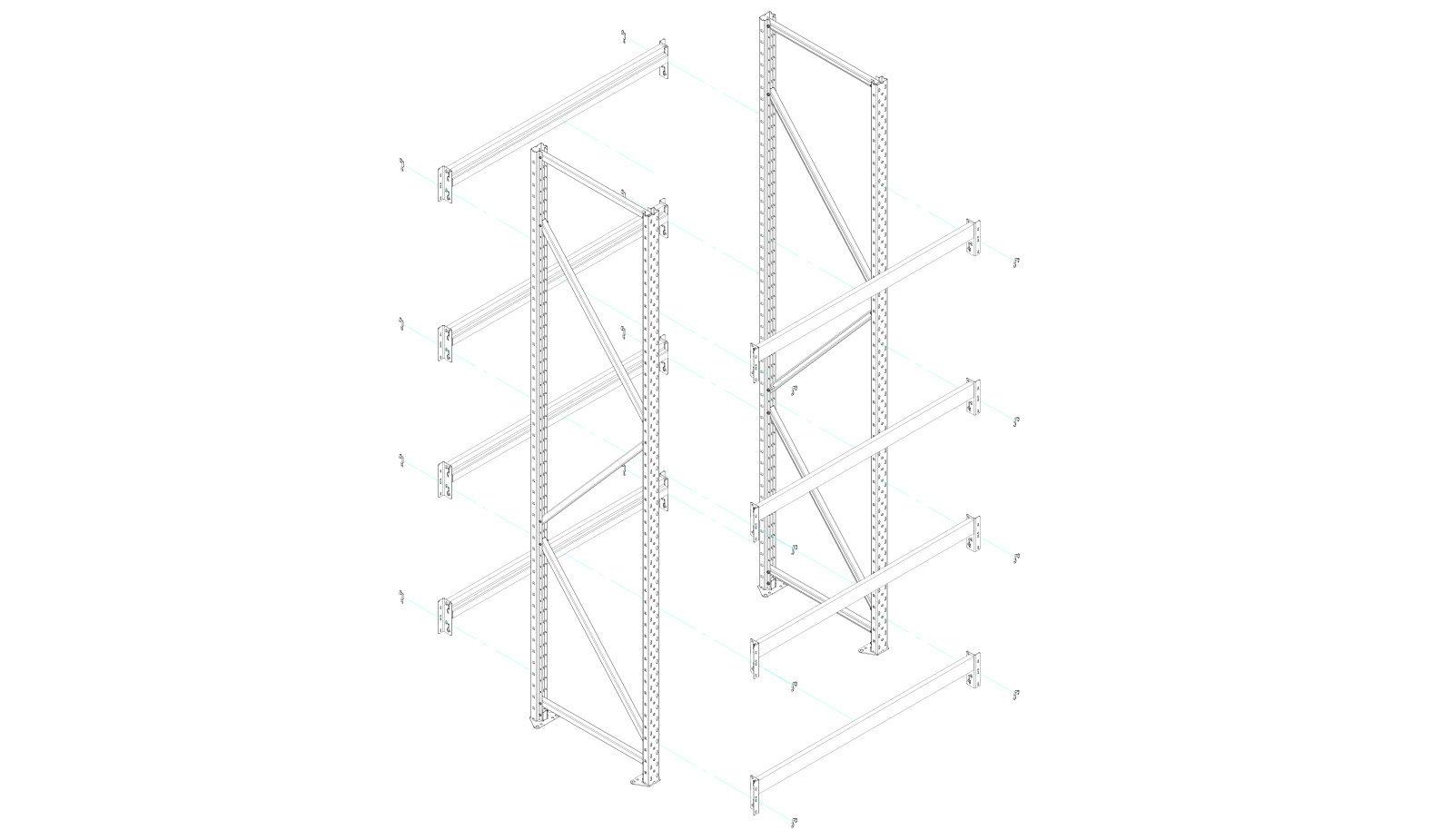 Ustaw wstępnie zmontowane słupki, zawieś poprzeczki po obu stronach na żądanej wysokości w profilu słupka i włóż sworznie blokujące do otworu w poprzeczce. Poprzeczki są zawieszone w siatce o rozstawie 50 milimetrów. Należy upewnić się, że ostatnia poprzeczka jest zamontowana co najmniej 50 centymetrów przed końcem stojaka.