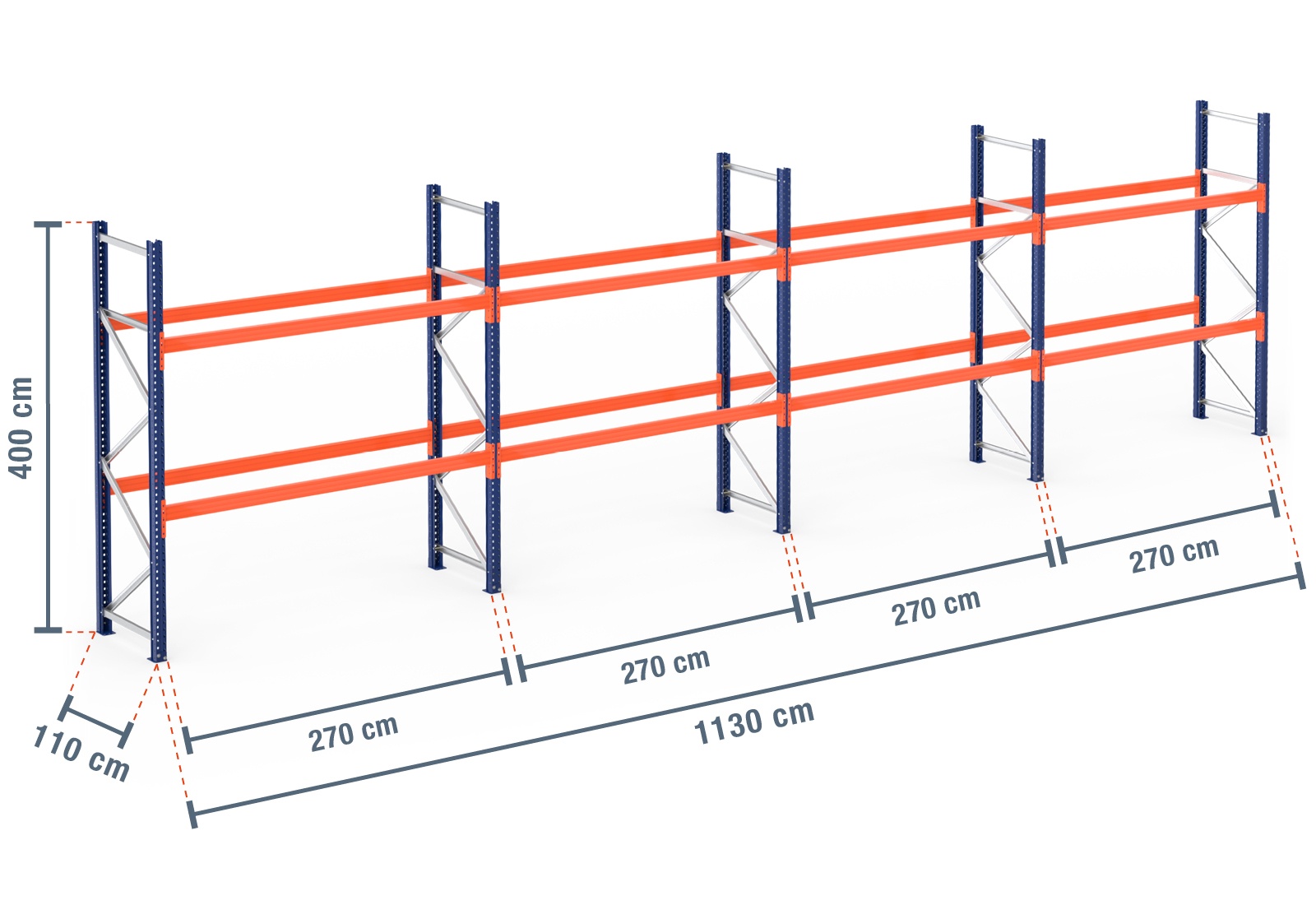 • 5 x stojak PR9000 4 m wysokości / 110 cm głębokości w tym zabezpieczenie podporami ukośnymi, obciążenie pola: 9.000 kg