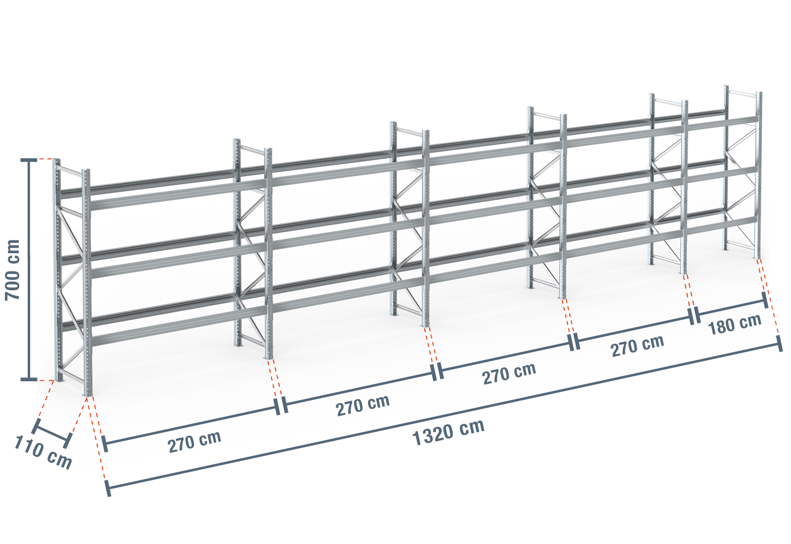 13,2 m regał paletowy PR9000F ogniowo ocynkowany / 110 cm głębokości / 7 m wysokości / 3 poziomy na 56 europalety