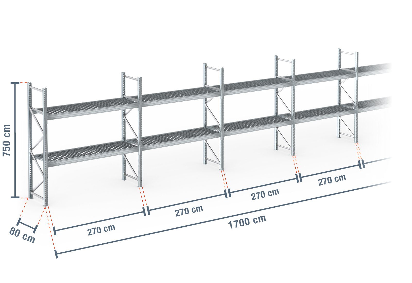 17 m regał paletowy PR9000F ogniowo ocynkowany / 80 cm głębokości / 7,5 m wysokości / 2 poziomy / półki ruszt kratowy