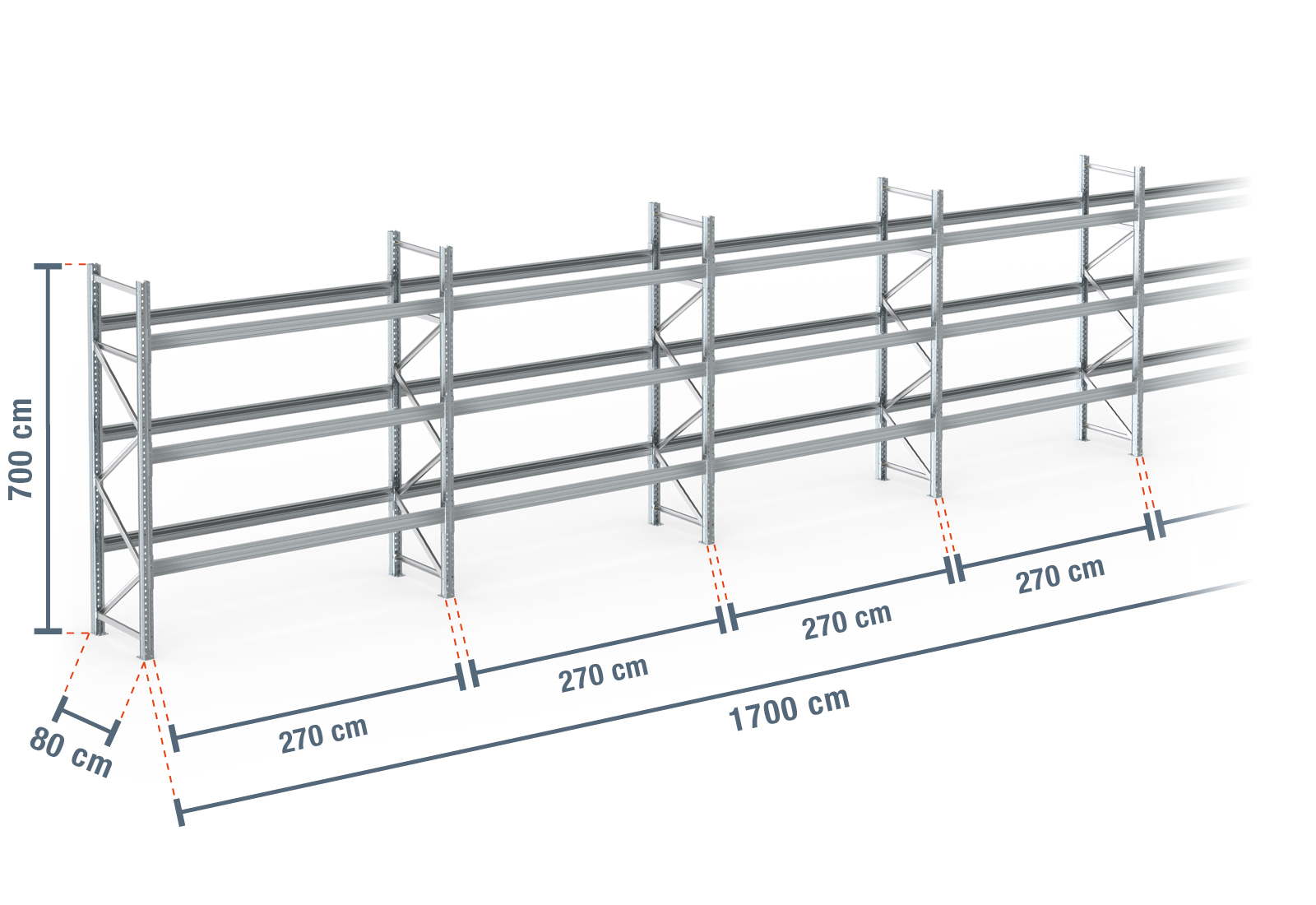 - 7 x stojak PR9000F 7 m wysokości / 80 cm głębokości w tym zabezpieczenie podporami ukośnymi, obciążenie pola: 9.000 kg