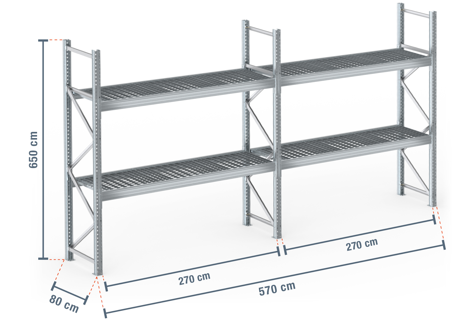 5,7 m regał paletowy PR9000F ogniowo ocynkowany / 80 cm głębokości / 6,5 m wysokości / 2 poziomy / półki ruszt kratowy