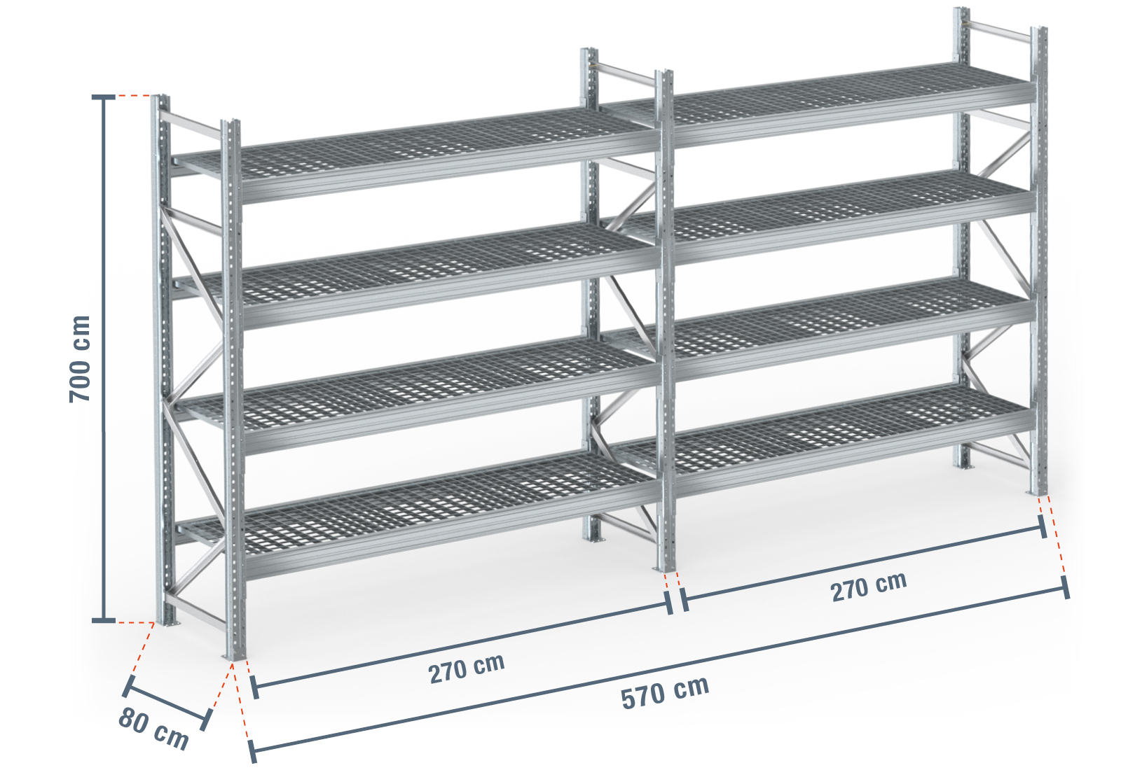 5,7 m regał paletowy PR9000F ogniowo ocynkowany / 80 cm głębokości / 7 m wysokości / 4 poziomy / półki ruszt kratowy