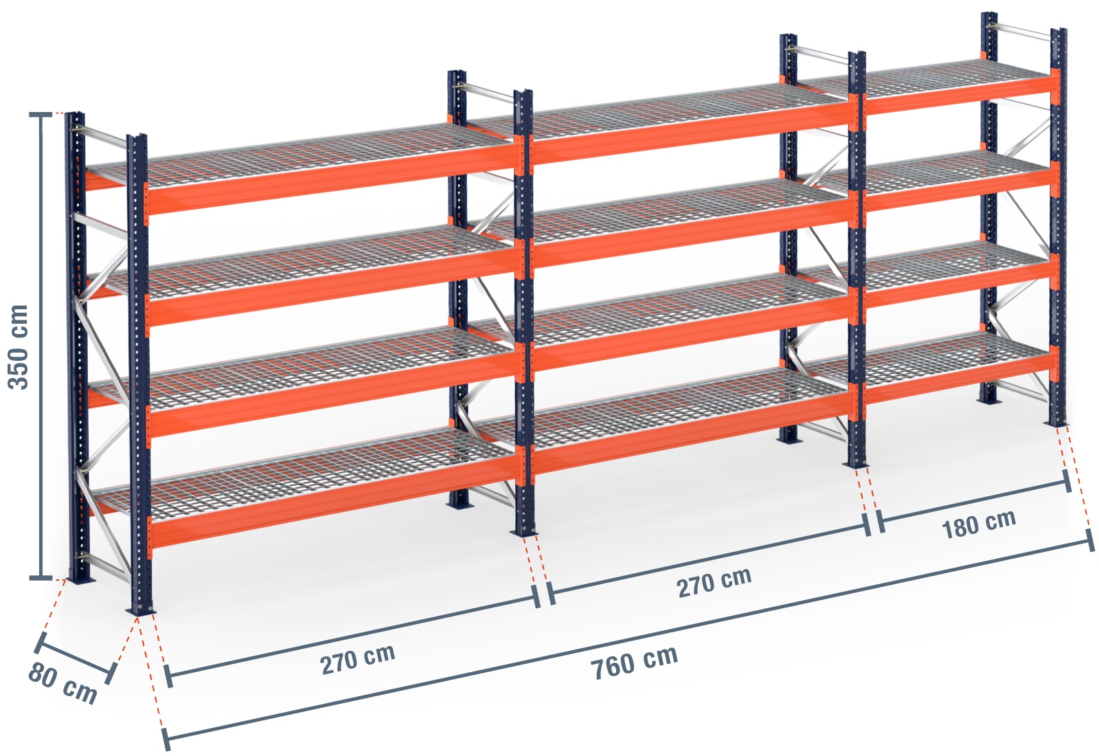 7,6 m regał paletowy PR15000 / 80 cm głębokości / 3,5 m wysokości / 4 poziomy / półka ruszt kratowy