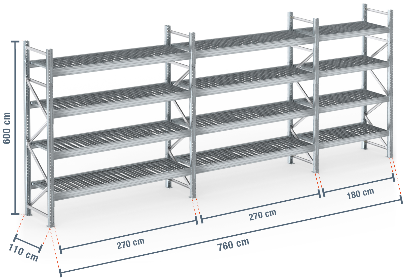 7,6 m regał paletowy PR9000F ogniowo ocynkowany / 110 cm głębokości / 6 m wysokości / 4 poziomy / półki ruszt kratowy