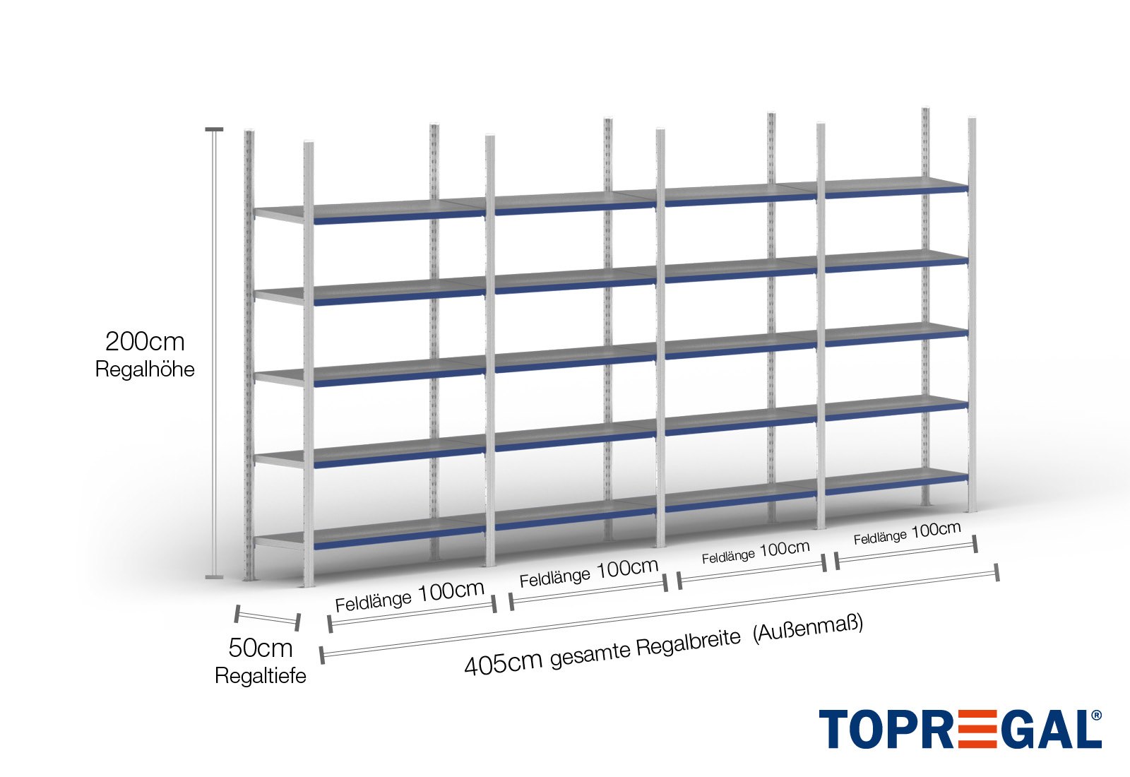 4 m regał metalowy FB200 / 50 cm głębokości / 2 m wysokości / 5 poziomy / stal półki / obciążenie półki 200 kg