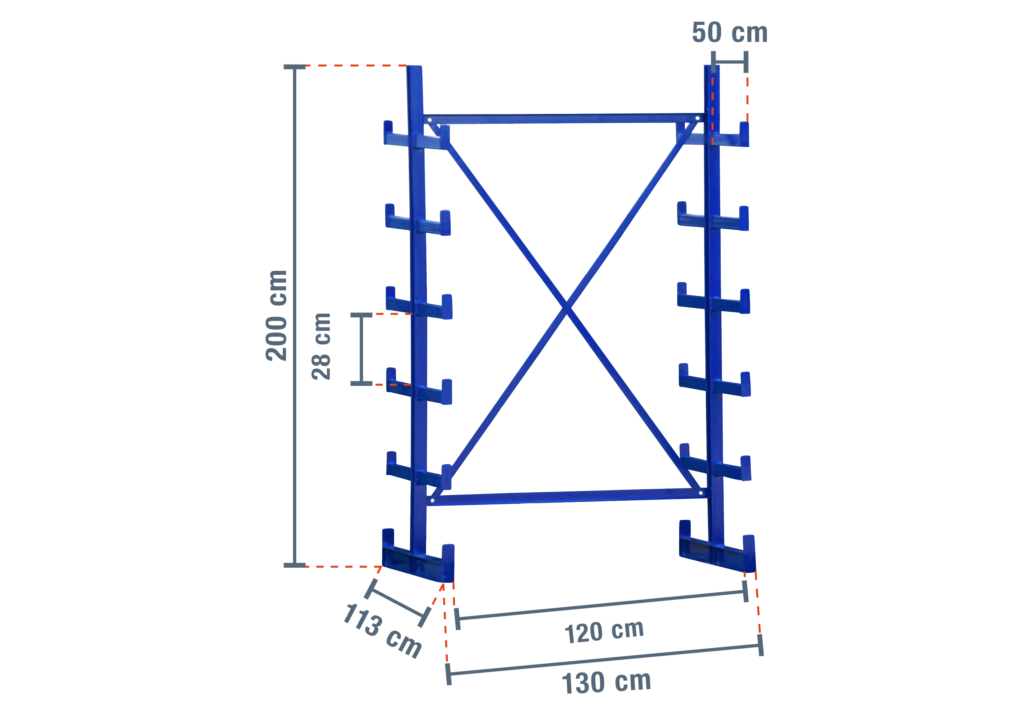 Ten szczególnie wytrzymały regał wspornikowy o szerokości 1,3 m ma 2 m wysokości i 5 poziomy o głębokości ramion 50 cm. Dzięki dwustronnemu wykonaniu z przyspawanymi już wspornikami, można obciążyć każdy stojak maksymalnie 2.500 kg, przy czym każde ramię ma maksymalne obciążenie 250 kg.