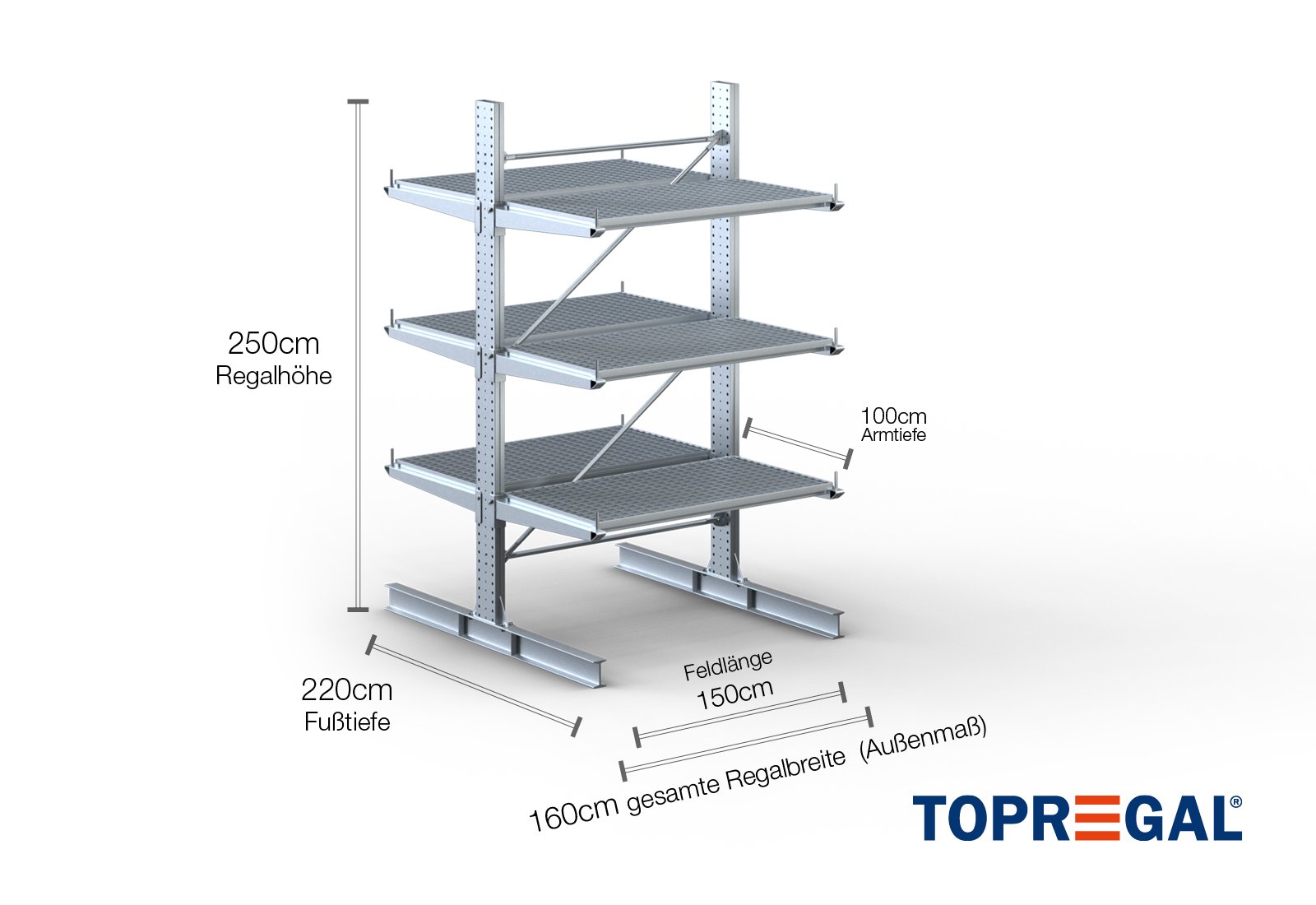 Ten regał wspornikowy w wykonaniu dwustronnym o szerokości 1,6 m ma 2,5 m wysokości, głębokość całkowitą wynoszącą 220 cm i dysponuje 3 poziomami wsporników o głębokości ramienia 100 cm. Maksymalne obciążenie na ramię wynosi przy tym maksymalnie 500 kg. Wsporniki mogą być indywidualnie zawieszane w rastrze 50 mm i są zabezpieczane sworzniem blokującym. Również części stopy mogą (w zależności towaru) być używane jako poziom magazynowy. Aby zabezpieczyć ładunek przed omyłkowym zsunięciem, na końcu każdego wspornika można włożyć zabezpieczenie przed stoczeniem się. Standardowo jest ono zawarte w zakresie dostawy.