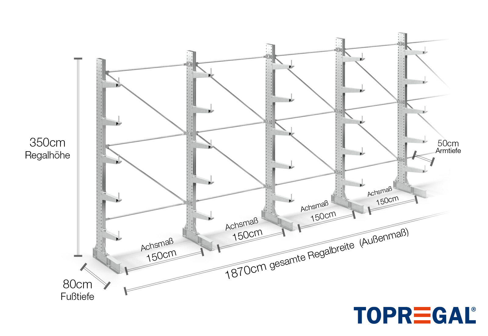 Ten regał wspornikowy w wykonaniu jednostronnym o szerokości 18,7 m ma 3,5 m wysokości, głębokość całkowitą wynoszącą 80 cm i dysponuje 5 poziomami wsporników o głębokości ramienia 50 cm. Maksymalne obciążenie na ramię wynosi przy tym maksymalnie 500 kg. Wsporniki mogą być indywidualnie zawieszane w rastrze 50 mm i są zabezpieczane sworzniem blokującym. Również części stopy mogą (w zależności towaru) być używane jako poziom magazynowy. Aby zabezpieczyć ładunek przed omyłkowym zsunięciem, na końcu każdego wspornika można włożyć zabezpieczenie przed stoczeniem się. Standardowo jest ono zawarte w zakresie dostawy.