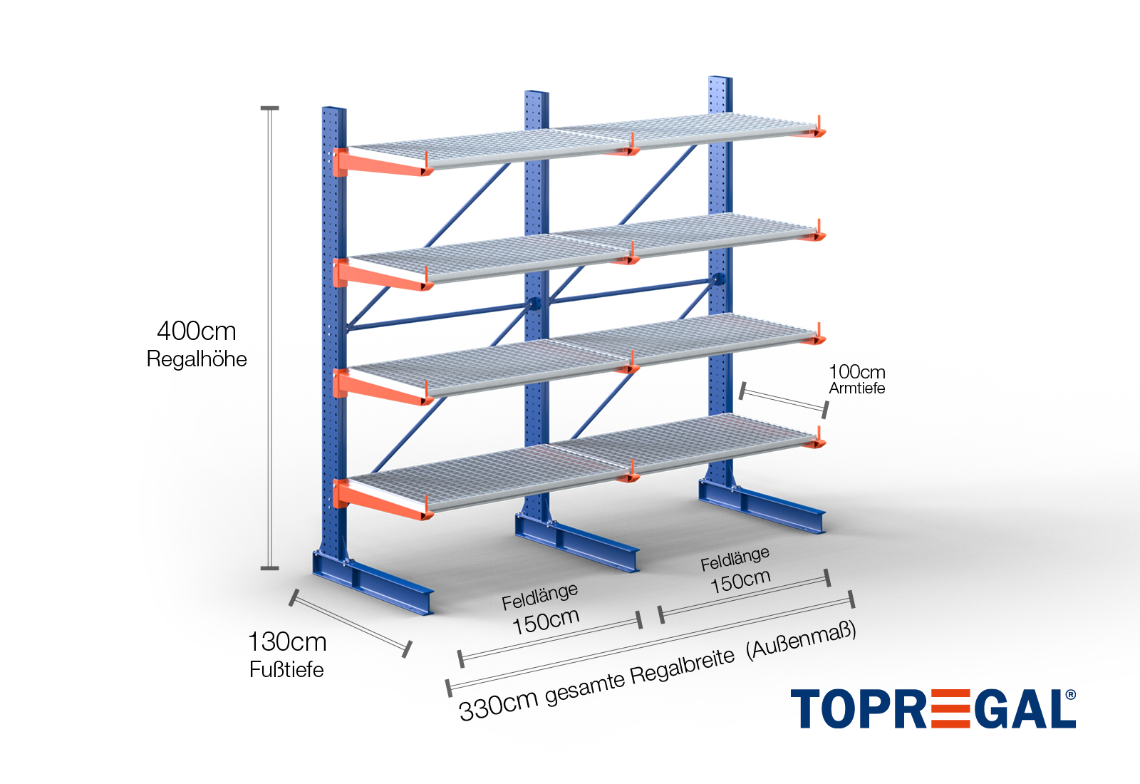 Ten regał wspornikowy w wykonaniu jednostronnym o szerokości 3,3 m ma 4 m wysokości, głębokość całkowitą wynoszącą 120 cm i dysponuje 4 poziomami wsporników o głębokości ramienia 100 cm. Maksymalne obciążenie na ramię wynosi przy tym maksymalnie 500 kg. Wsporniki mogą być indywidualnie zawieszane w rastrze 50 mm i są zabezpieczane sworzniem blokującym. Również części stopy mogą (w zależności towaru) być używane jako poziom magazynowy. Aby zabezpieczyć ładunek przed omyłkowym zsunięciem, na końcu każdego wspornika można włożyć zabezpieczenie przed stoczeniem się. Standardowo jest ono zawarte w zakresie dostawy.