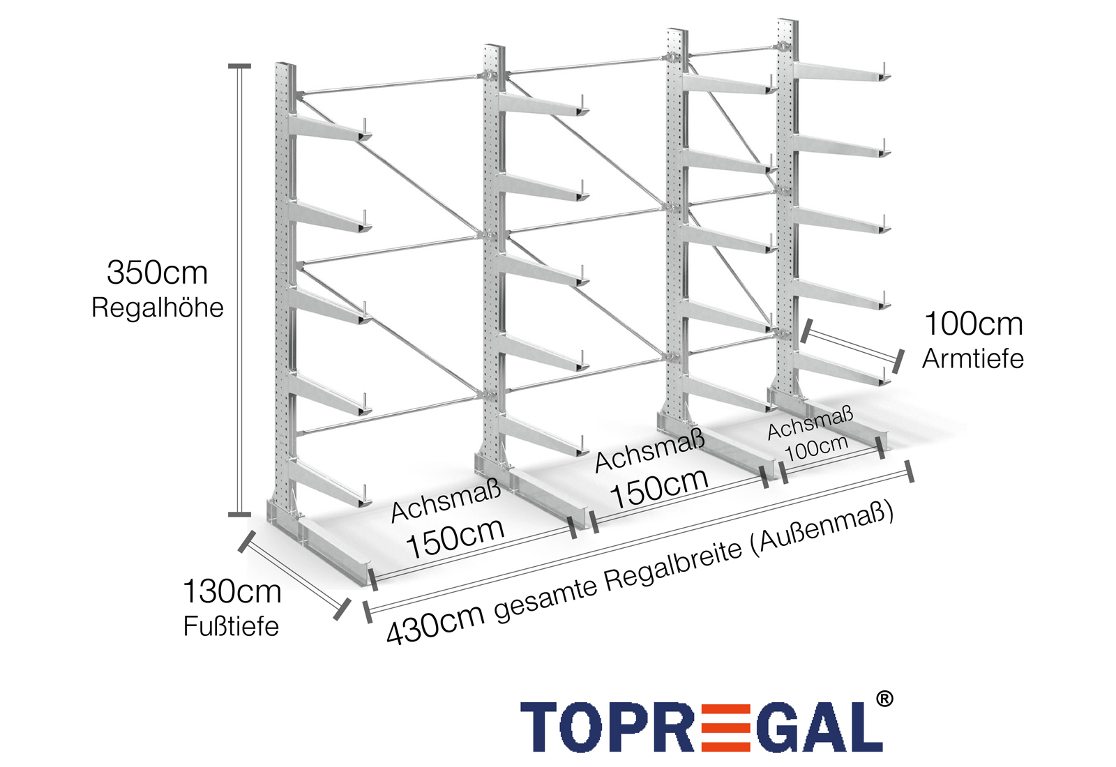 Ten regał wspornikowy w wykonaniu jednostronnym o szerokości 4,3 m ma 3,5 m wysokości, głębokość całkowitą wynoszącą 130 cm i dysponuje 5 poziomami wsporników o głębokości ramienia 100 cm. Maksymalne obciążenie na ramię wynosi przy tym maksymalnie 500 kg. Wsporniki mogą być indywidualnie zawieszane w rastrze 50 mm i są zabezpieczane sworzniem blokującym. Również części stopy mogą (w zależności towaru) być używane jako poziom magazynowy. Aby zabezpieczyć ładunek przed omyłkowym zsunięciem, na końcu każdego wspornika można włożyć zabezpieczenie przed stoczeniem się. Standardowo jest ono zawarte w zakresie dostawy.