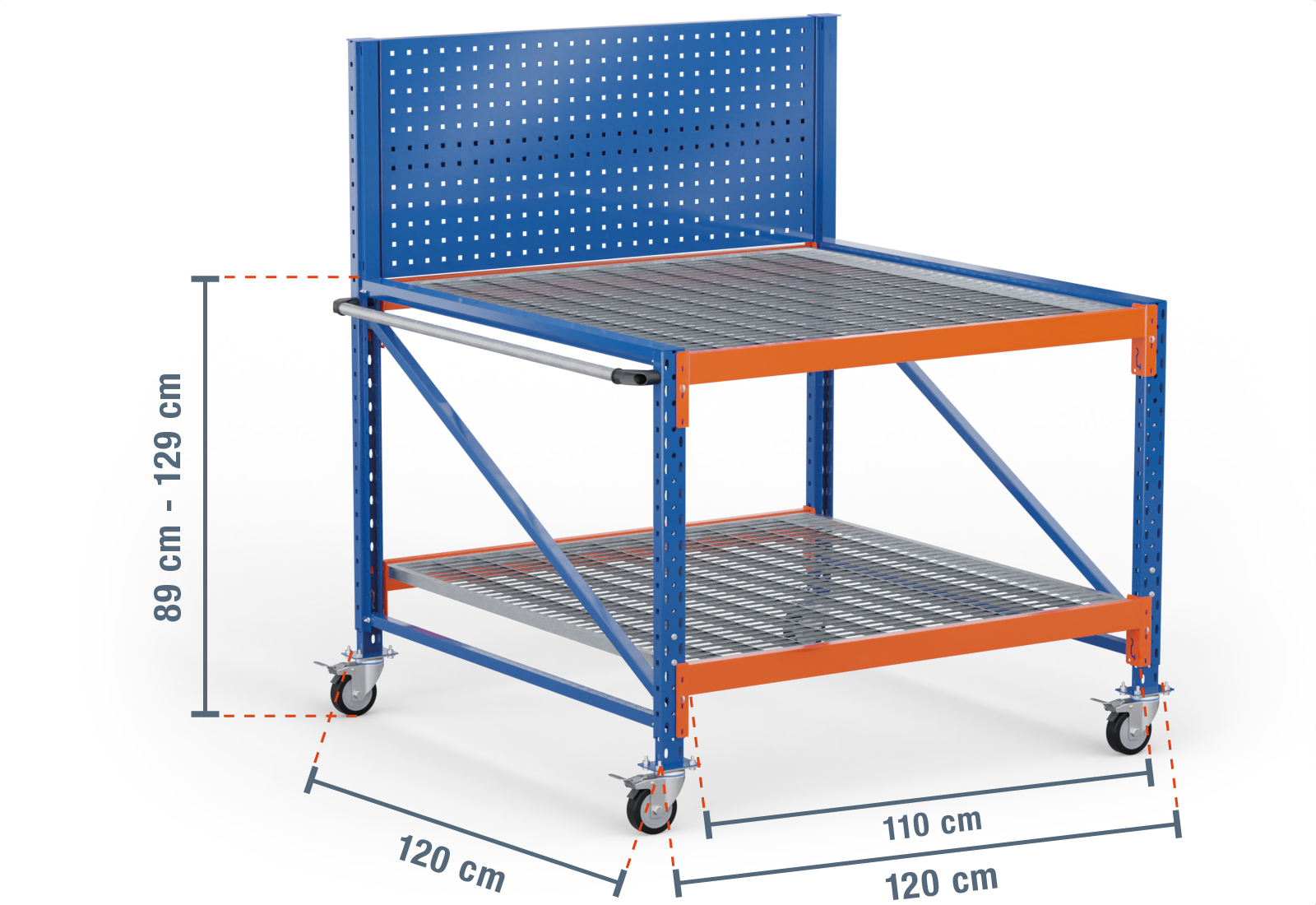 1,2 m stół roboczy na kółkach MFW1000-AT / 120 cm głębokości / 890 - 1.290 mm wysokości / 2 poziomy / półki ruszt kratowy / tylna ściana z otworami
