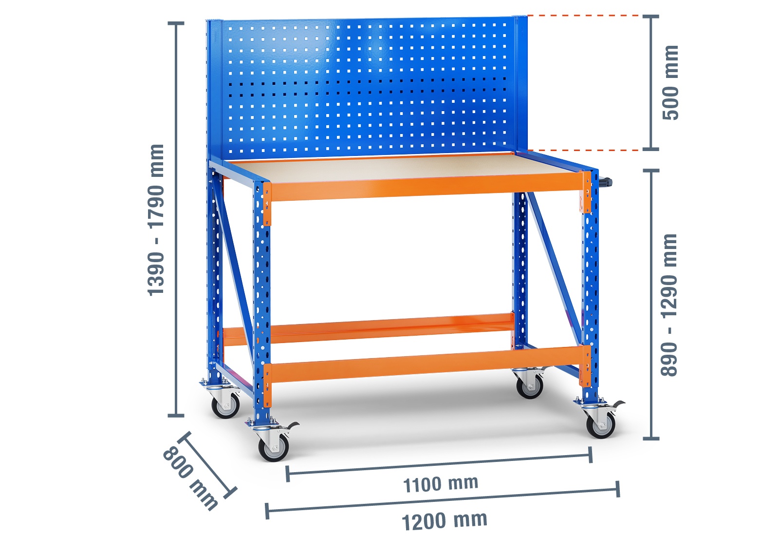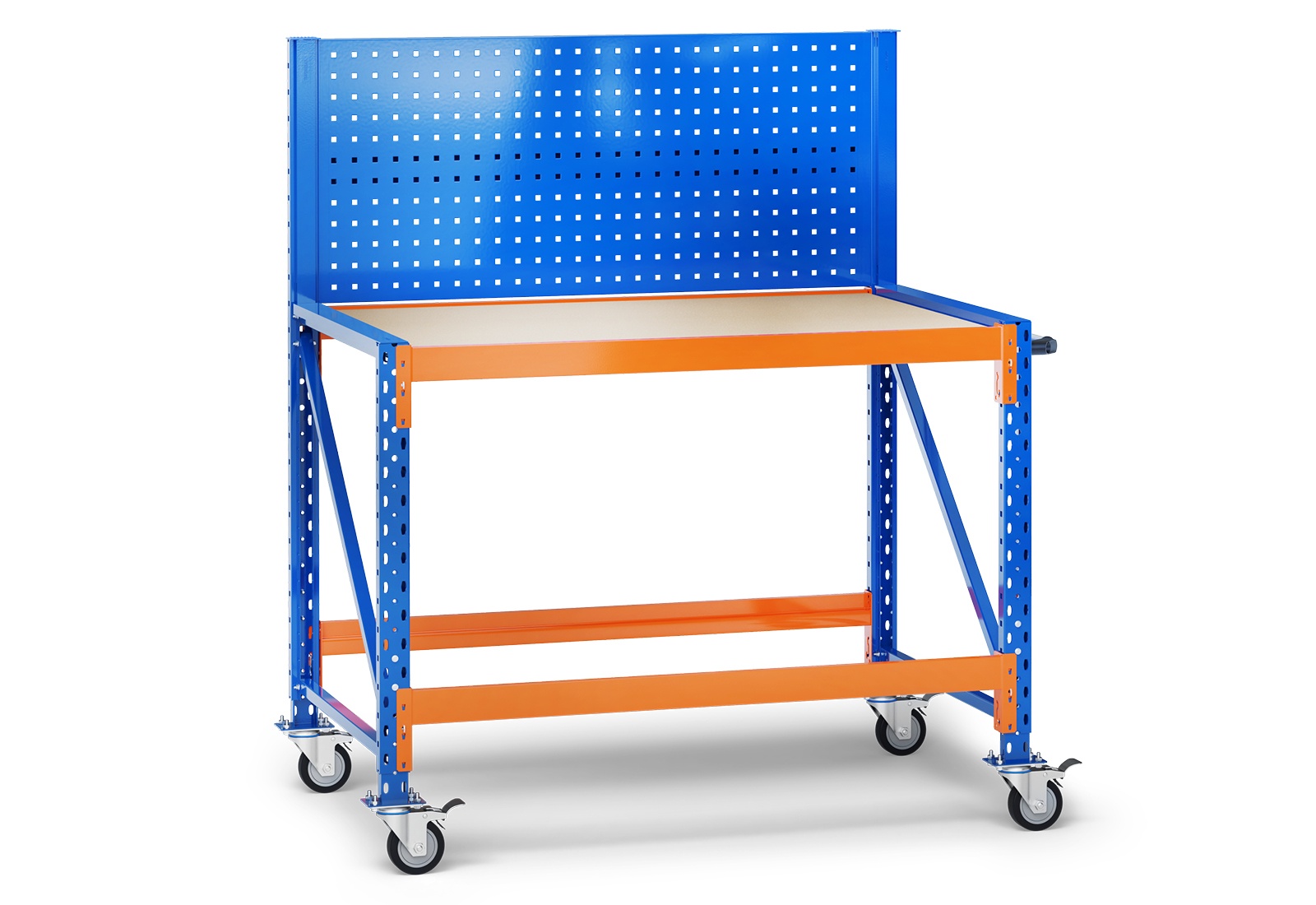 1,2 m stół warsztatowy na kółkach MFW1000 / 80 cm głębokości / 890 - 1.290 mm wysokości / półki drewno / tylna ściana z otworami