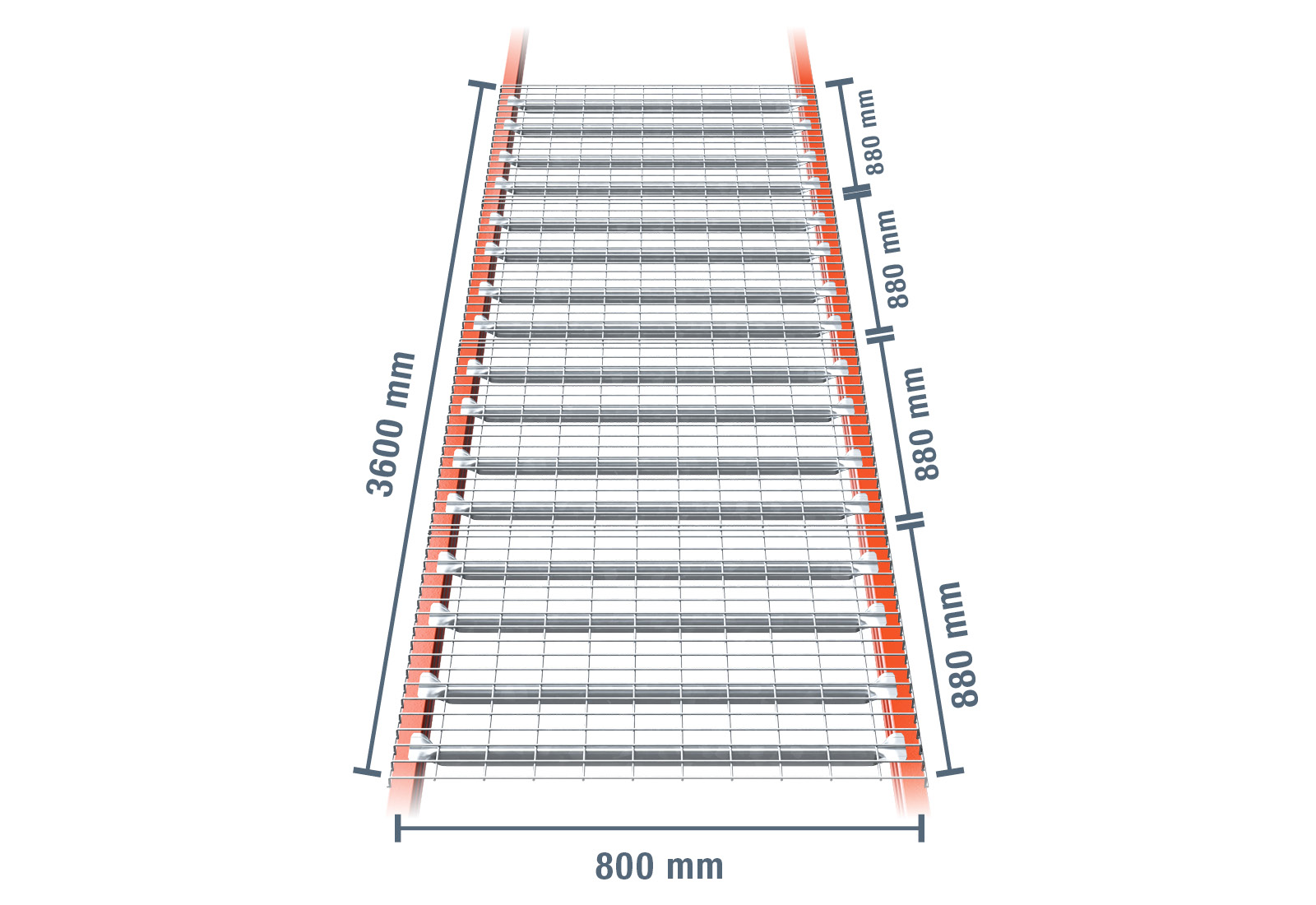 Ta siatka druciana jest montowana z 4 modułów siatki drucianej, o głębokości 800 mm i szerokości 880 mm. Dzięki temu szerokość całkowita wynosi 360 cm. Maksymalna nośność tej siatki drucianej przy równomiernym rozłożeniu obciążenia wynosi 2.200 kg. Przy załadunku regału paletowego należy przestrzegać podanego maksymalnego obciążenia półki i pola PR9000. Do zastosowania na zewnątrz polecamy kratownice ze stali ocynkowanej ogniowo.
